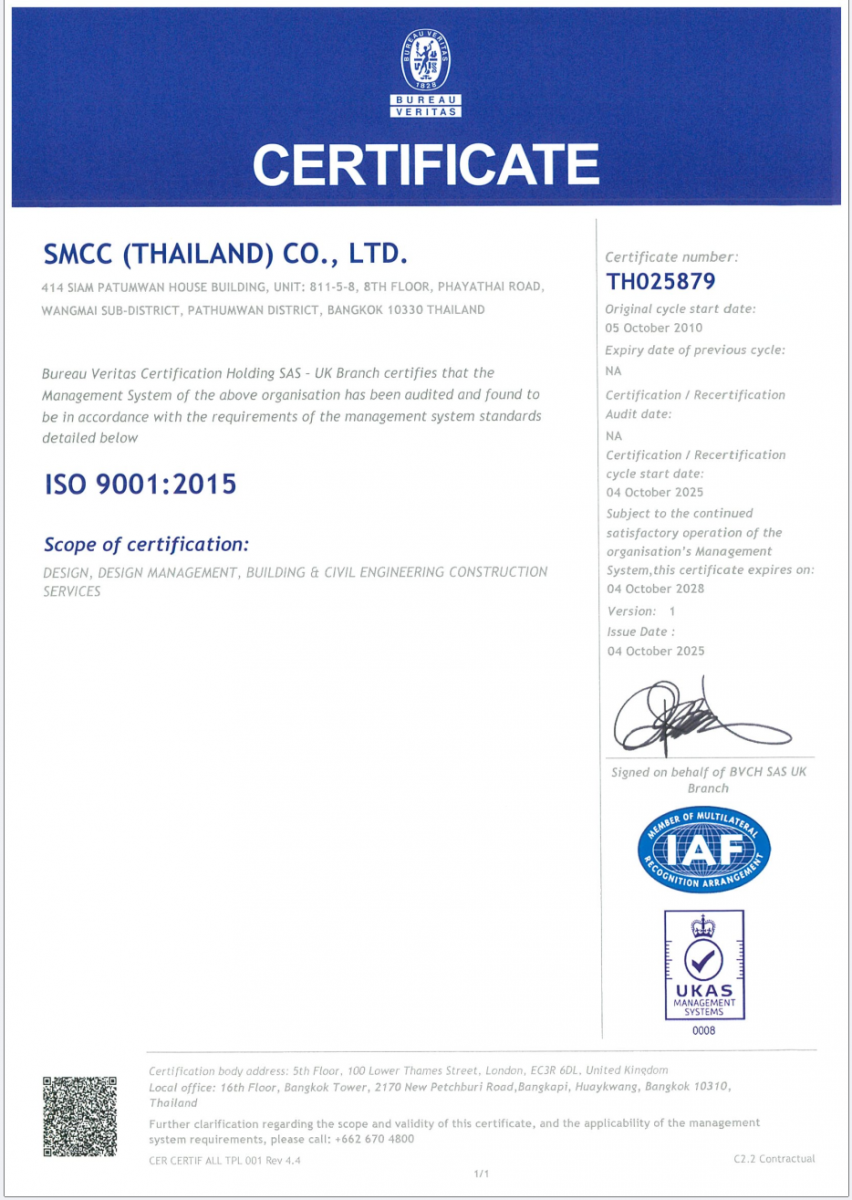 SMCC (THAILAND) CO.,LTD is a company with operations that design, construction and civil engineering management. The company strives to develop operational management system for quality, safety and environment, and keeping up to improve such system among all management and employees.